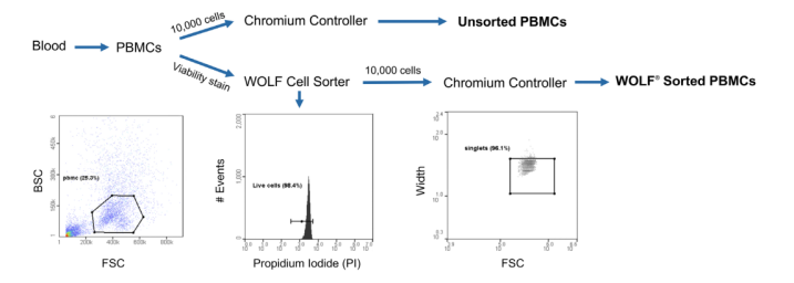本文將展示WOLF在測序流程中的表現。 從血液中分離出 PBMC,然后將其分成兩個樣本:未分選的PBMC和WOLF分選的PBMC。