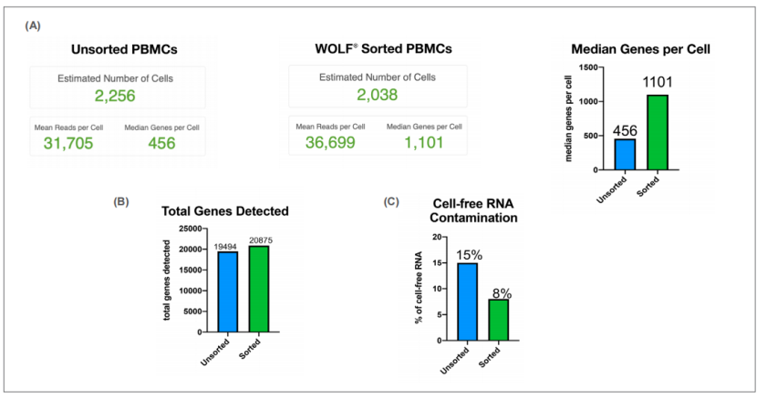 測序結果的質量直接取決于所制備樣品的質量。WOLF細胞分選儀是一種非常可靠的樣品制備方法,可以分離靶細胞,同時去除死細胞、碎片和粘連細胞。在比較未分選和WOLF分選樣本的10x基因組測序結果時,WOLF顯著改善了測序結果。具體來說,文庫的復雜性和PBMC的讀取次數都得到了改善。