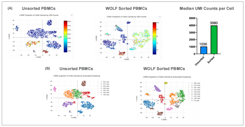 通過Cell Ranger在我們的未分選和WOLF分選樣本上生成了T-distributed Stochastic Neighbor Embedding(T-SNE)圖。通過UMI計數著色的細胞的t-SNE投影顯示,與WOLF分選樣品相比,未分選樣品中每個細胞的低UMI計數細胞(藍點)明顯更多。具體來說,在我們的WOLF分選樣本中,每個細胞檢測到的UMI大約是其他細胞的3倍。這反映了在WOLF分選樣本中檢測到的每個細胞的RNA轉錄物數量更多(下圖A)。通過自動聚類著色的細胞的t-SNE投影在未分選的樣品中僅產生7個細胞簇。此外,在WOLF分選的樣本中,聚類更加明顯(下圖B)。這些結果進一步表明,在WOLF分選的樣品中,背景污染減少,測序深度更高。