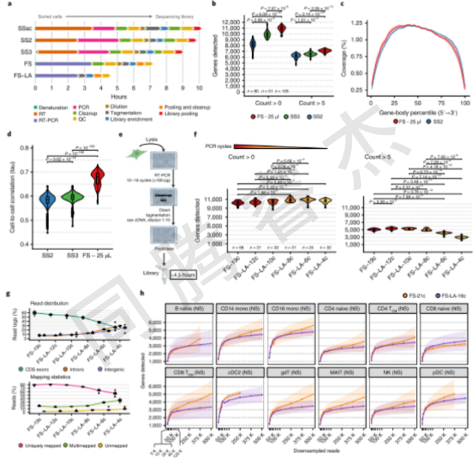圖1. FS和FS低放大(FS-LA)協議概述。a,為本研究中使用的全長scRNA-seq協議處理96孔HEK293T細胞的估計協議持續時間。步驟用顏色編碼。質量控制包括濃度和粒度分布測量。SSSC,SMART-SEQ單細胞套件(Takara)。b,在兩個讀取閾值下處理SS2(n=80)、SS3(n=51)和FS(n=105)處理的HEK293T細胞中檢測到的基因數量,其中讀取下采樣到500,000(=500K)原始讀取。c,平均值±標準差(S.D.)HEK293T細胞的基因體覆蓋。d,在SS2(n=80)、SS3(n=51)和FS(n=105)中僅使用所有三種方法表達的基因(n基因=20,042)之間的Kendall‘s tau相關性。e,FS-LA工作流。所需的聚合酶鏈式反應周期數是細胞RNA含量的函數。f,使用250K下采樣原始讀取處理的HEK293T細胞中檢測到的基因數量。基因檢測閾值設置為>;0或>;5讀數。g,頂部的面板顯示了用FS或FS-LA處理的HEK293T細胞中映射到外顯子(=CDS外顯子)、內含子或基因間特征的閱讀標簽的百分比,使用ReSQC測量。底部面板顯示了FS和FS-LA的映射統計信息以及唯一映射、多映射或未映射讀取的百分比。h,平均值±S.D.HPBMC樣本中每種細胞類型檢測到的基因數(>;0讀取)。僅顯示兩個或多個單元格支持的點。一些細胞沒有足夠的覆蓋面,無法在每一個點上得到代表。在每種細胞類型的125K讀數下,使用Wilcoxon秩和檢驗(雙側Bonferroni校正,調整P值)來評估FS和FS-LA中基因數量的差異。兩組間差異無統計學意義(P>;0.05)。MAIT,粘膜相關不變T細胞;單核細胞;NK,自然殺傷細胞;Tcm,中央記憶T細胞;TEM,效應記憶T細胞;GDT,γ-增量T細胞;PDC,漿細胞樣樹突狀細胞;cDC2,常規樹突狀細胞2。采用雙側Dunn‘s檢驗,并經Bonferroni校正,調整后的P值為b,d和f。f和g中的盒子圖顯示中位數(中心),第25/75%百分位數(下/上鉸鏈),1.5×四分位數范圍(胡須)和異常值(點)。。
