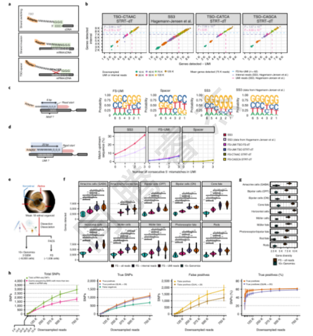 圖2. 在FS-UMI中,鏈入侵事件得到緩解。a,鏈切換反應發生在cDNA末端(上);當UMI和核苷序列相鄰時(中),鏈入侵事件增加,但被間隔區序列減輕(下)。b,使用UMI在HEK293T細胞中檢測到的基因數量與幾個下采樣測序深度(NSS3=85,NSS3_Hagemann-J)的內部讀數之間的關系。=101、NFS-CTAAC_STRT-DT=76、NFS-CAGCA_STRT-DT=16)。藍線表示FS中檢測到的平均基因數(μL=85,75K讀數)。紫色/粉紅色線條表示在SS3中檢測到的基因的平均數量(Hagemann-Jensen等人5,UMI=粉色,INTERNAL=紫色,75K讀數)。比較兩種讀數類型(雙側Wilcoxon秩和檢驗,Bonferroni調整P值,按讀數類型著色)5和其他條件下在75K讀數時檢測到的基因數量。c,使用500K隨機選擇的UMI(HEK293T),在讀出開始附近的6-堿基對中的核苷酸分布。d,均值±S.D.去重復的UMI讀數(%)包含UMI與上游序列之間的匹配,在20個堿基對內,有0到3個連續的5‘不匹配(NSS3=2,089,581,NSS3_Hagemann-J)。=13,511,157,NFS-UMI-TSO_STRT-dt=1,404,599,NFS-CTAAC_STRT-dt=9,964,516,NFS-CAGCA_STRT-dt=1,189,676,UMI讀取)。e,通過寡聚-DT/TSO組合著色。視網膜器質與實驗設計。視網膜和非視網膜部分突出顯示。f,使用10x基因組學和FS-UMI(UMI,內部或兩者同時讀取)在典型細胞類型中檢測到(>;0讀取)基因。Dunn‘s檢驗(雙側,Bonferroni調整P值)。雙極開,開中心雙極電池;雙極關,偏離中心的雙極電池。g、基因多樣性。通過對每種細胞類型的10個細胞重新采樣100次,并計算在兩個以上細胞中使用>;0讀取(包括UMI/內部讀取)表達的基因的數量。h,平均值±S.D.在不同的下采樣讀取深度檢測到SNPs(nsf_retinalods=1,281)。對于每個細胞,轉錄區域的外顯子組SNPs測序(測序深度(=dp)和gt;2)作為參考。在FS-UMI(綠色,DP&>2)或參考(粉色)中檢測到的SNPs總數。在FS-UMI和參照物(橙色,DP>;2;紫色,DP>;2和變異質量(=QUAL)>;20)中檢測到真陽性SNPs。假陰性SNP,FS-UMI中未檢測到參考SNP(深綠色)。假陽性SNPs,在FS-UMI中檢測到,但在參考文獻中不存在(黃色,DP>;2;Brown,DP>;2&QUAL>;20)。真陽性SNPs(%),在參考SNPs中檢測到的真陽性SNPs的百分比。f和g中的框圖顯示了中位數(中心)、25%/75%(下/上鉸鏈)、1.5×四分位數范圍和異常值(點)。